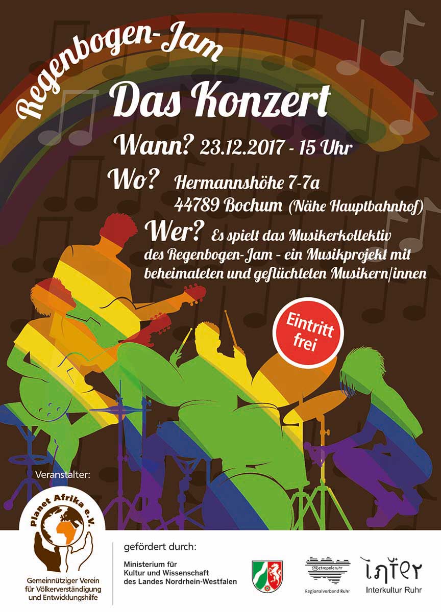 Regenbogen-Jam ist ein gemeinsames Musikprojekt mit jungen geflüchteten Musikern/innen und beheimateten jugendlichen Musikern/innen. Es finden Proben/Sessions statt, bei denen die Teilnehmer, die durch ihre Kultur geprägte Musik einbringen können. Ein gemeinsames Programm wird entwickelt , in das die verschiedenen Einflüsse eingearbeitet werden, nebeneinander existieren und vor allem auch Neues entstehen soll. Das Programm wird am Ende des Jahres in Form eines Konzerts Besuchern dargeboten.